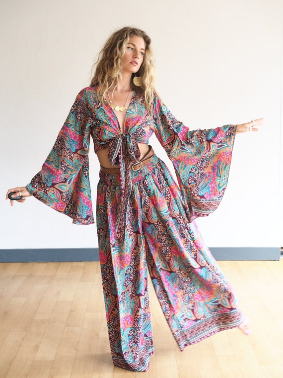 PAISLEY BROWN FLEETWOOD - Wrap Dress - Beach Kaftan - Recycled Silk Maxi - Stevie Nicks Skirt - Bell sleeve kimono - 70's Vintage Retro